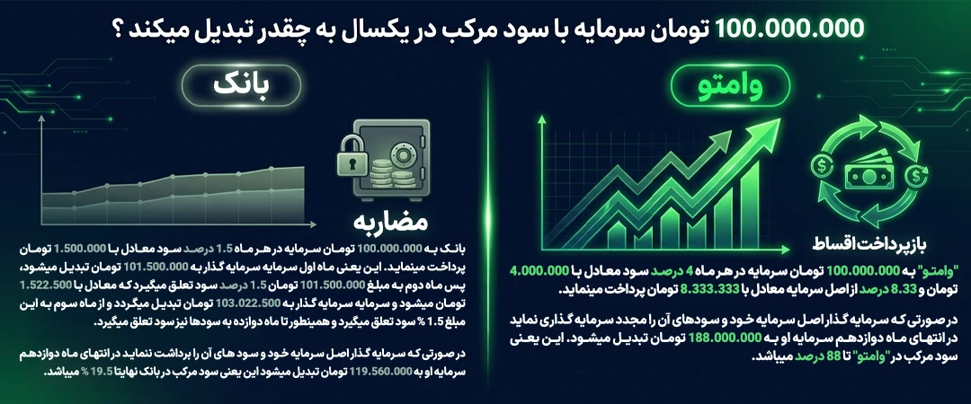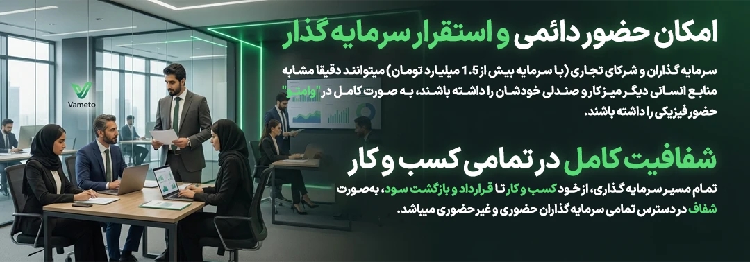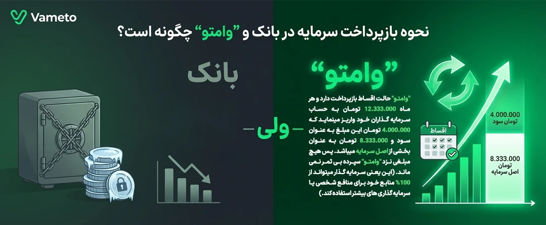 تفاوت اصلی طرحهای سرمایهگذاری وامتو با سپردههای بانکی در میزان سود، انعطافپذیری و شفافیت است. در حالی که سپرده بانکی سود ثابتی دارد، طرحهای وامتو با مدیریت حرفهای و مشارکت در پروژههای واقعی، امکان کسب سود بالاتری را فراهم میکنند. همچنین اطلاعات کامل هر طرح در اختیار سرمایهگذار قرار میگیرد تا تصمیمگیری آگاهانهتری داشته باشد.