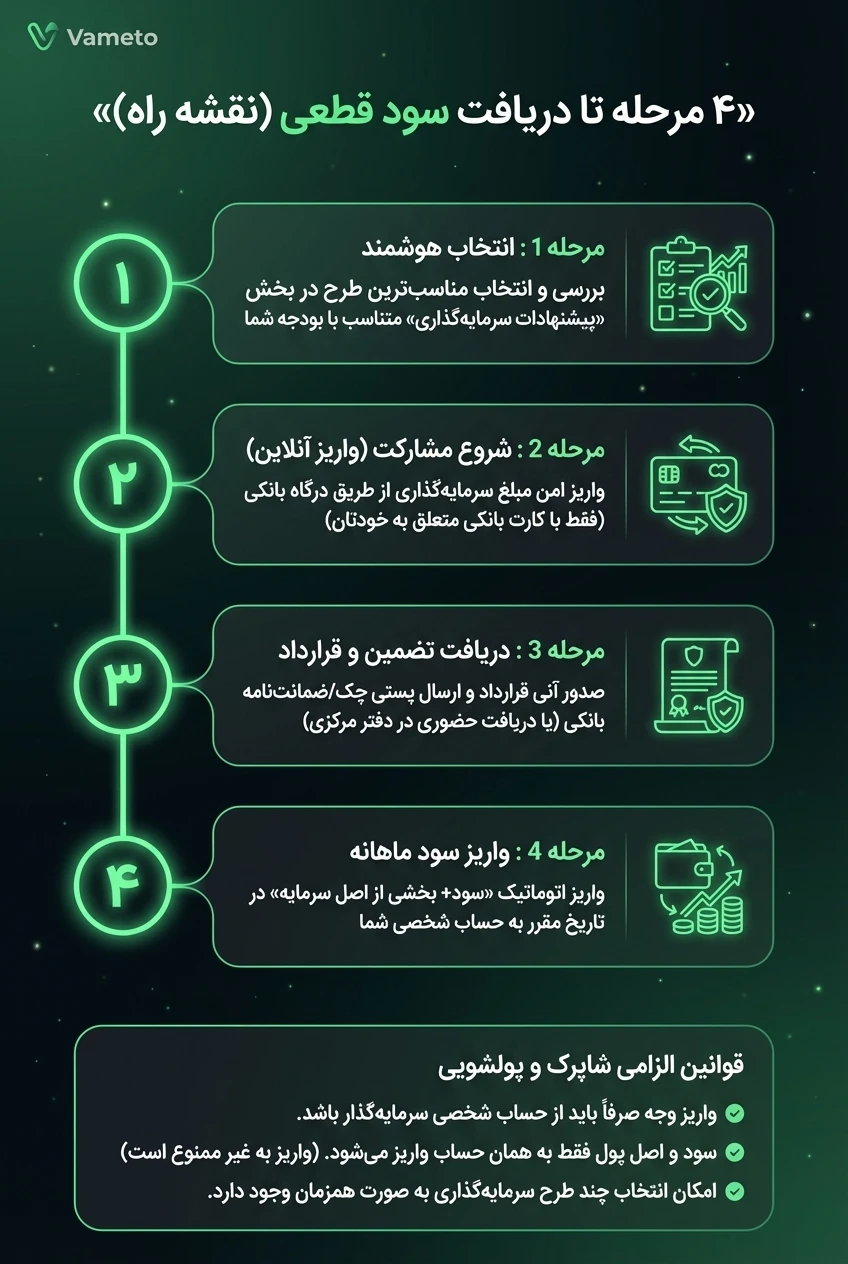 تضمین اصل سرمایه در وامتو به این معناست که مبلغ اولیهای که شما سرمایهگذاری میکنید، تحت سازوکارهای کنترلی و حقوقی مشخص محافظت میشود. وامتو با استفاده از قراردادهای شفاف، ارزیابی دقیق طرحها و مدیریت ریسک حرفهای، تلاش میکند امنیت سرمایه کاربران را در بالاترین سطح ممکن حفظ کند. این رویکرد باعث میشود سرمایهگذاران با اطمینان بیشتری وارد فرآیند سرمایهگذاری شوند و دغدغهای بابت از بین رفتن اصل سرمایه نداشته باشند.